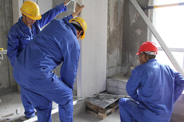 2、根據排版圖進行墻板的拼縫,把板固定在結構柱或地面的頂部與底部。避開門窗洞將板塊勾結鋪滿。